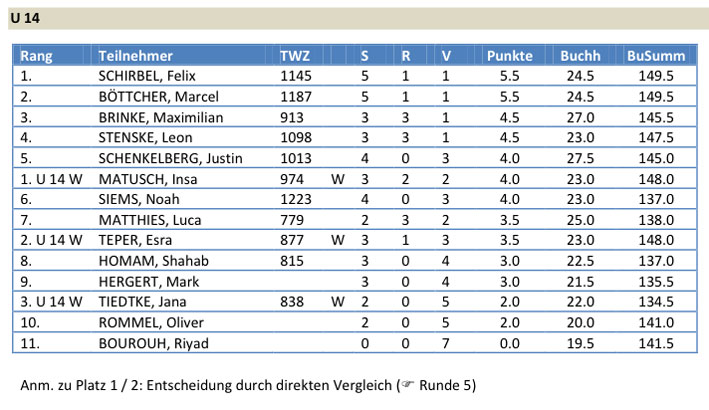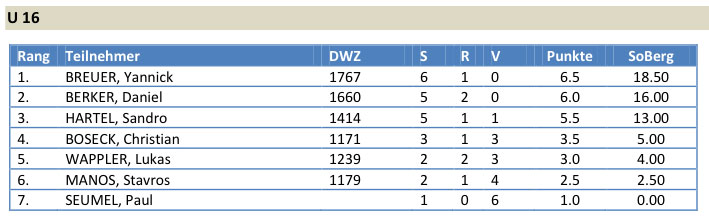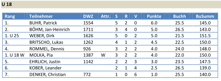 Noch mit dabei waren Stavros Manos (6. Platz U16 mit 2,5/7), Noah Siems (6. Platz U14 mit 4/7) und Christian Denker (7. Platz U18 mit 1/7).